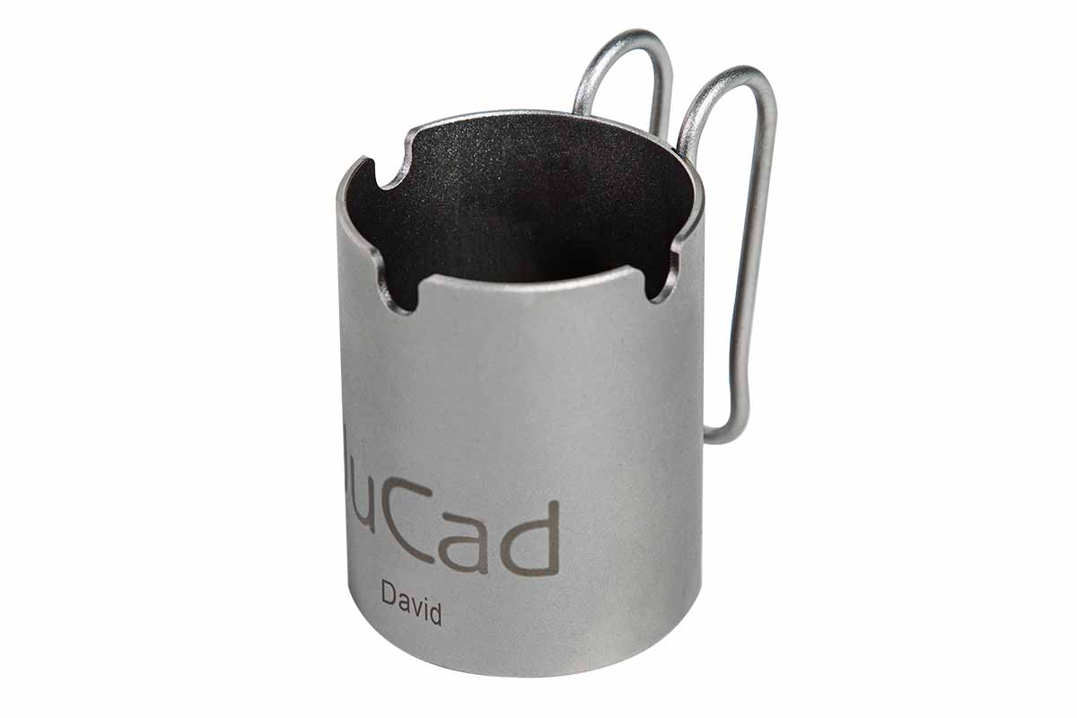 Der JuCad Aschenbecher wird aus Titan handgefertigt und einfach an das Golfbag gesteckt. Inklusive gratis Namensgravur.