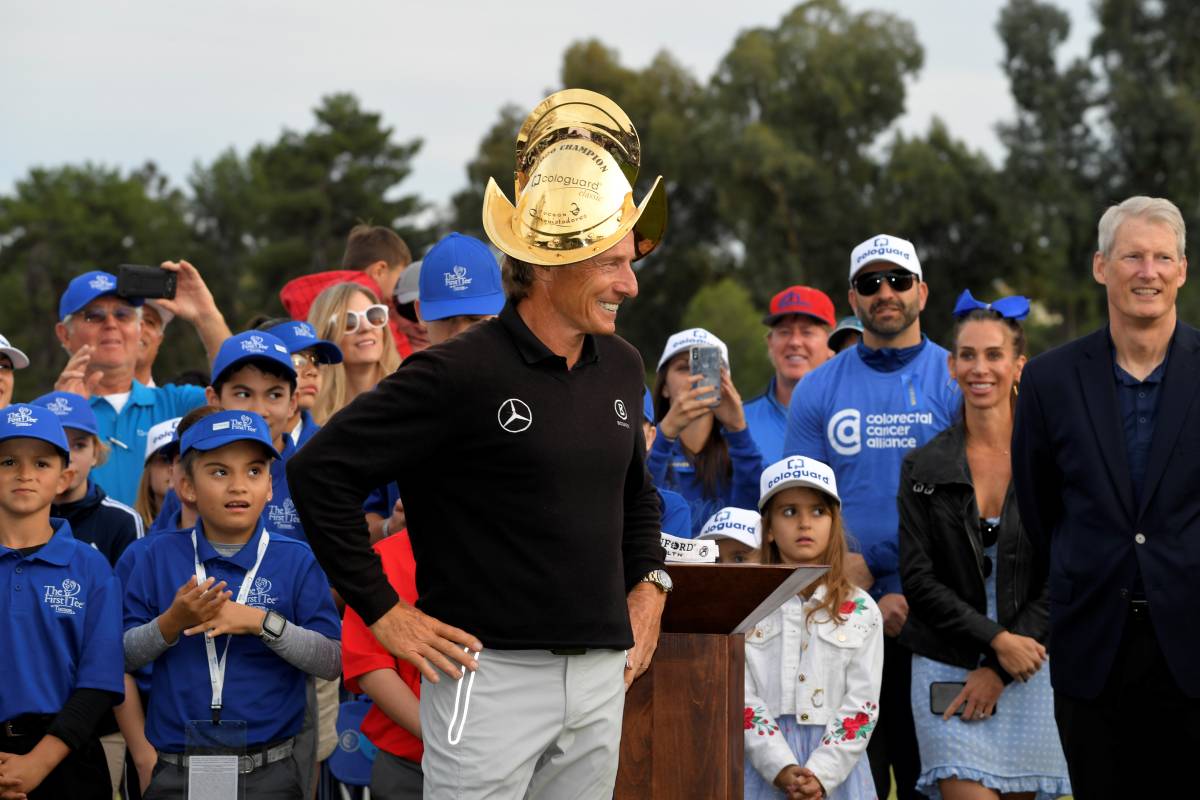 Gewohntes Bild: Bernhard Langer mit dem Charles Schwab Cup - bereits sein sechster. Trotz starker Rückenschmerzen rettet sich der Anhausener 2021 im Phoenix Country Club ins Ziel