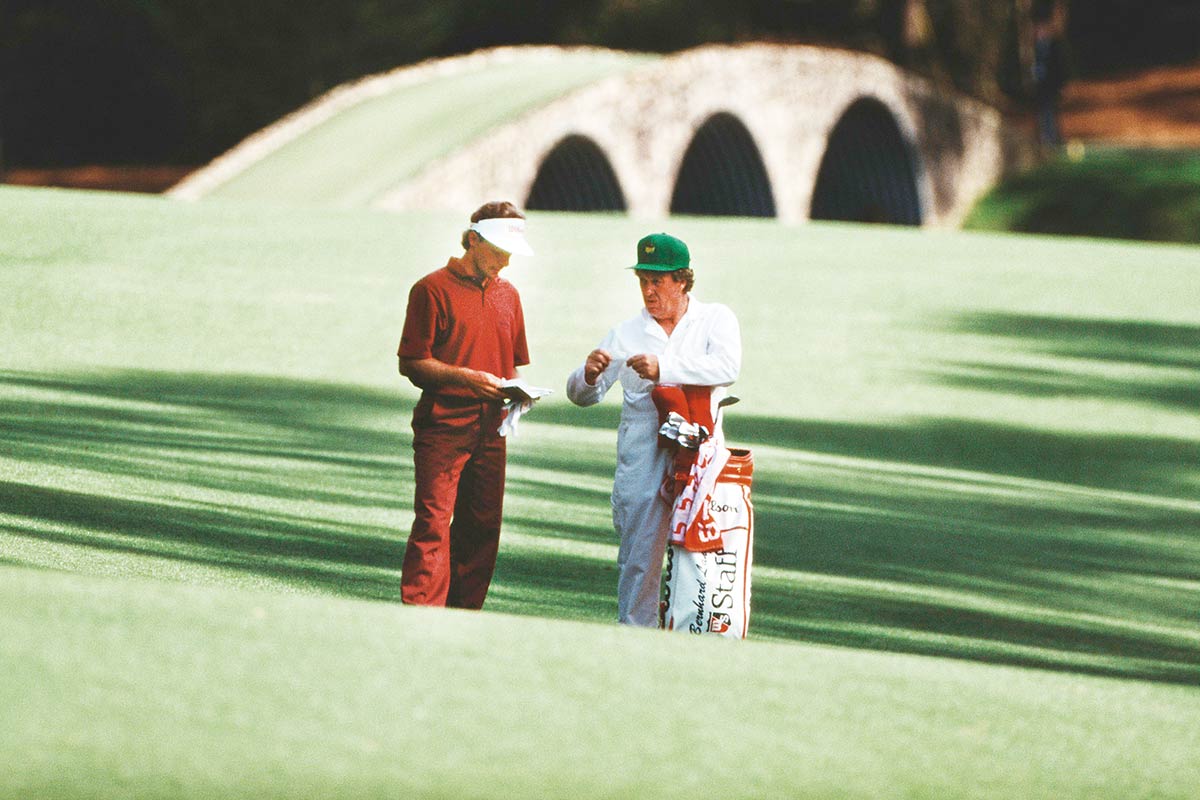 Einer der treuesten Wegbegleiter Langers war Caddie Peter Coleman (im Hintergrund die berühmte Ben Hogan Bridge in Augusta). Der Engländer trug die Tasche auch bei Langers