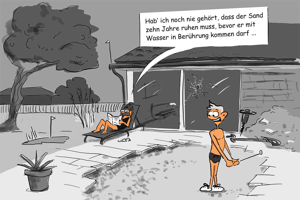 Hab‘ ich noch nie gehört, dass der Sand zehn Jahre ruhen muss, bevor er mit Wasser in Berührung kommen darf ...