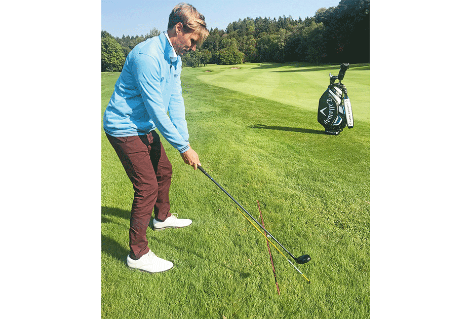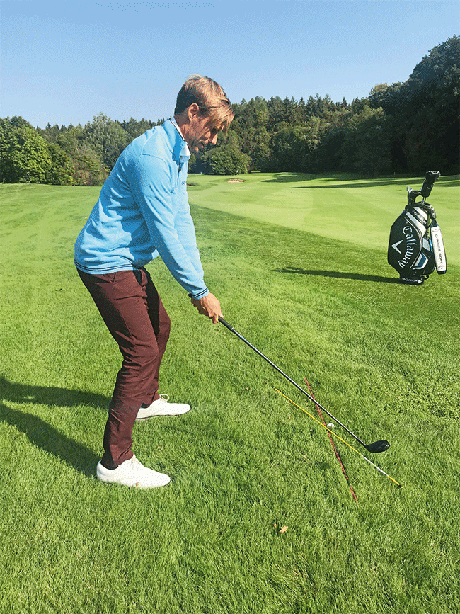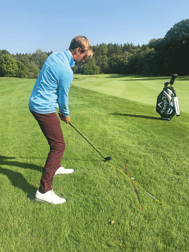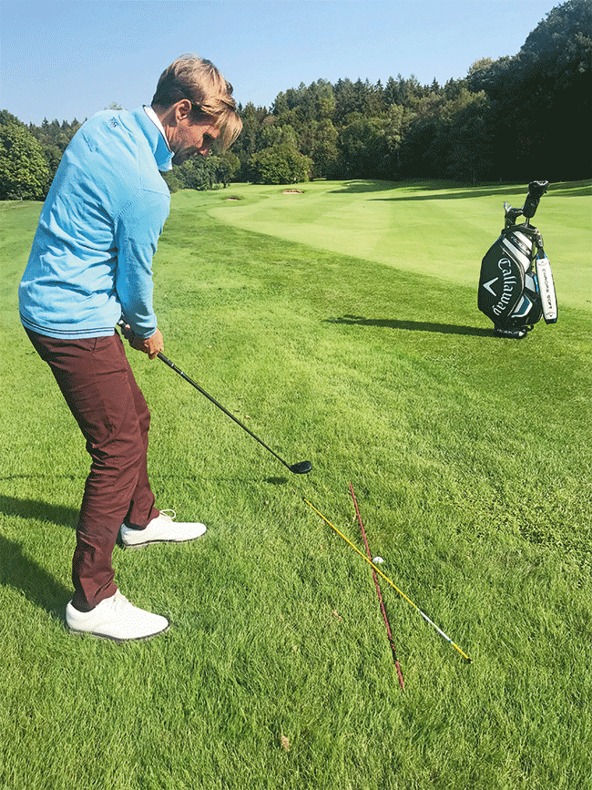 Durch die Schwungbahn (siehe Fotos gelbe Stange) von außen nach innen kommt man besser an den Ball heran. Dank der offenen Schlagfläche geht der Ball trotzdem geradeaus (siehe Fotos rote Stange) und fliegt nicht seitlich nach links.