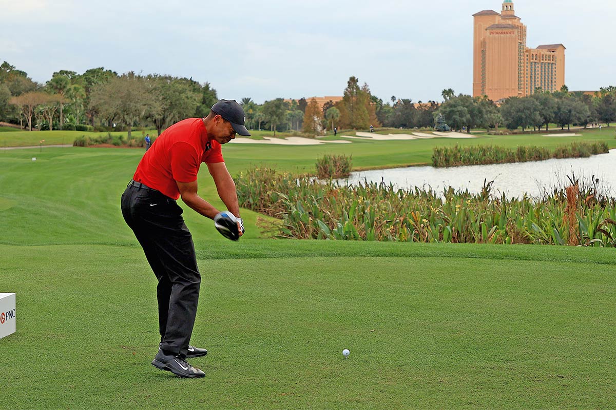Tiger steht hier im Setup mit seinen Schultern im Verhältnis zum Stand leicht nach links ausgerichtet. Vieles spricht hier für einen kleinen Fade. Der leicht geöffnete linke Fuß soll sein linkes Knie im Schwung entlasten.