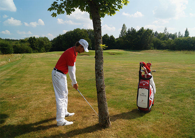Ausgangslage: Der Ball liegt direkt hinter einem Baum. Wie man aus einer unmöglichen Balllage heraus mit etwas Mut immer noch das Par retten kann.
