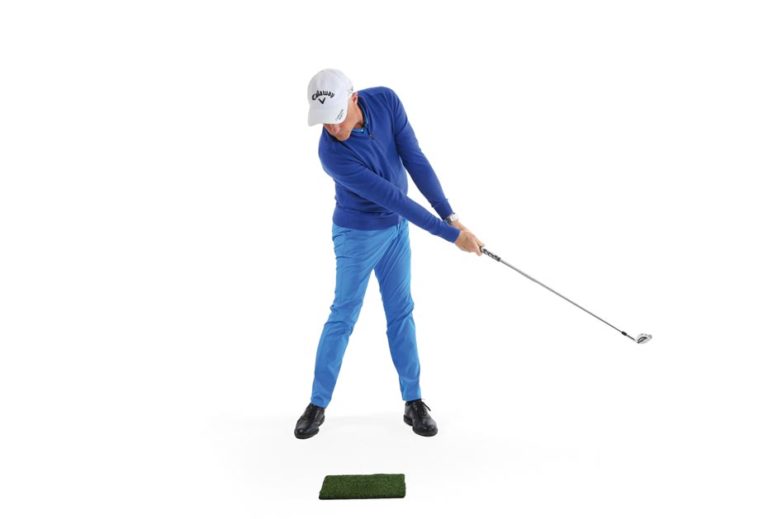 Ihr Schwerpunkt verlagert sich dabei aber nicht. Das Gleiche passiert übrigens auch beim Downswing: Wenn sich Hüfte und Schultern nach links drehen, baut das linke Bein einen Widerstand gegen die Schwungbewegung auf.