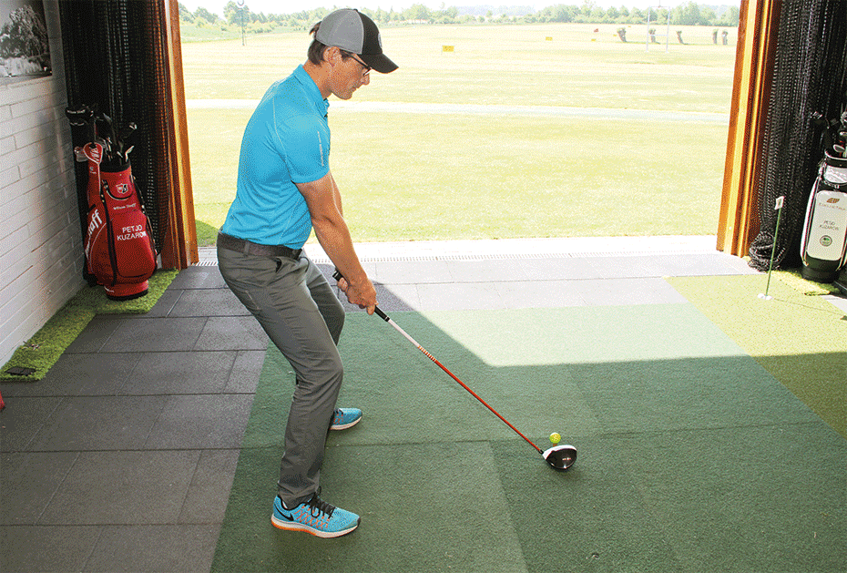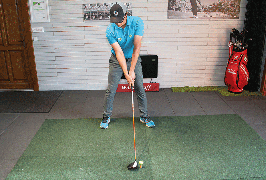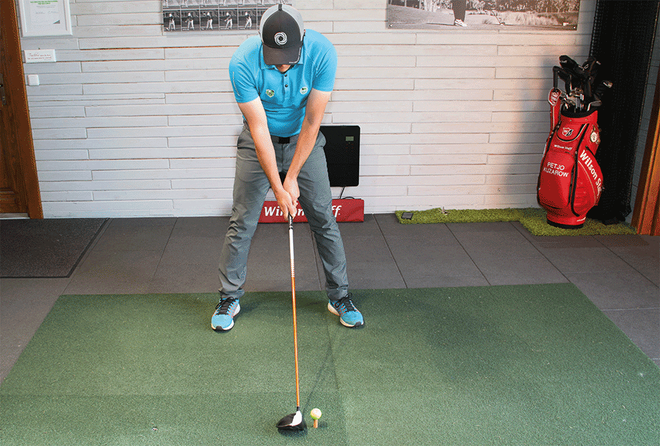 Sobald die rechte Hand den Schläger greift, verschiebt sich die Schulterachse leicht, wie auf den beiden unteren Fotos gut zu sehen. Dann öffne ich noch etwas mehr den linken Fuß in Richtung Ziel, um bei der folgenden Schwungbewegung das Knie zu entlasten. Und los kann’s gehen.